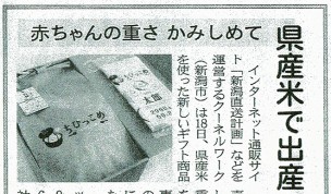 2017年11月7日 新潟日報の経済面にて、通販サイト「新潟直送計画」における、自社企画商品の第2弾となる出産内祝いギフト 名入れ体重米『ちびっこめ』の発売について取り上げていただ... -