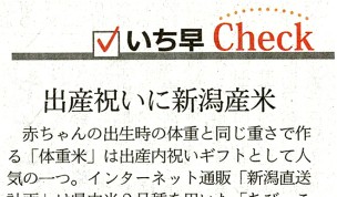 2017年11月8日 日経MJのいち早Checkというコーナーにて、通販サイト「新潟直送計画」における、自社企画商品の第2弾となる出産内祝いギフト 名入れ体重米『ちびっこめ』の発売... -