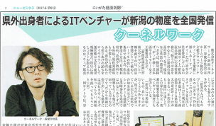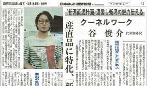 2017年11月23日 日本ネット経済新聞 合併号にて、当社代表の谷のインタビュー記事を掲載頂きました。 新潟直送計画の仕組みや今後の展開について、詳しく取材していた... -