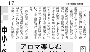 2017年9月14日 日経産業新聞にて、通販サイト「新潟直送計画」における、自社企画商品の第1弾となるウェアラブルアロマ『tagacu 〜たがく~』の発売について取り上げていただき... -