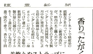 2017年8月26日 日本経済新聞の新潟経済面にて、通販サイト「新潟直送計画」における、自社企画商品の第1弾となるウェアラブルアロマ『tagacu 〜たがく~』の発売について取り上... -
