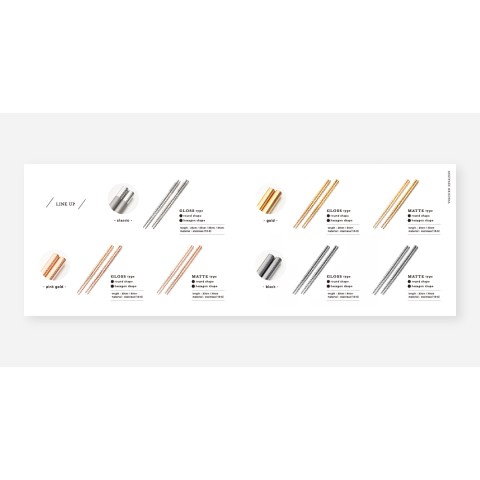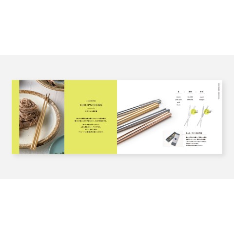 メインとなるステンレス製の箸は、色・形状・質感・長さの豊富なバリエーションが伝わるよう、図と写真を組み合わせた構成でわかりやすさを大切にしました。