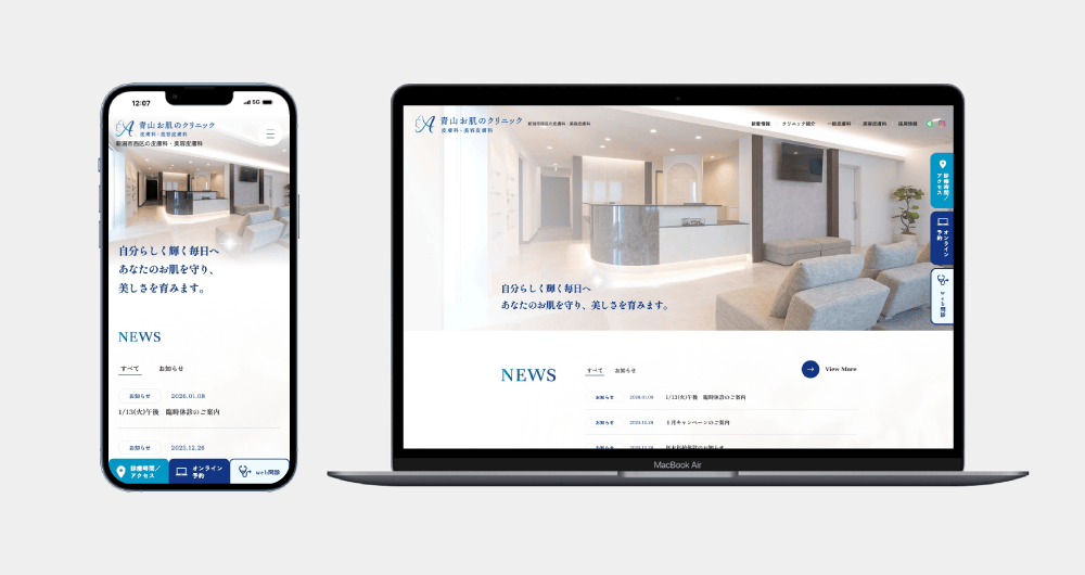 青山お肌のクリニック様は、「自分らしく輝く未来へ あなたのお肌を守り、美しさを育みます」をコンセプトに掲げる皮膚科・美容皮膚科クリニックです。一般皮膚科(保険診療)と美容皮膚科(自由診療)の双方に対応し、地域のお肌のかかりつけ医として、お一人おひとりに寄り添った診療を行われています。