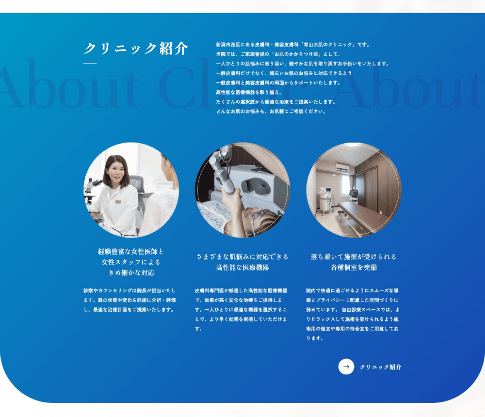 新潟県新潟市西区に開院された、青山お肌のクリニック様よりご依頼いただき、新規ホームページ制作を担当いたしました,。