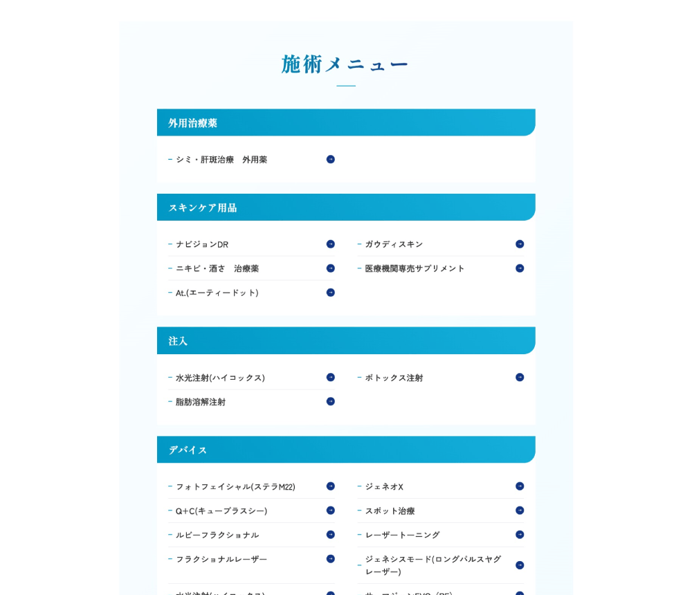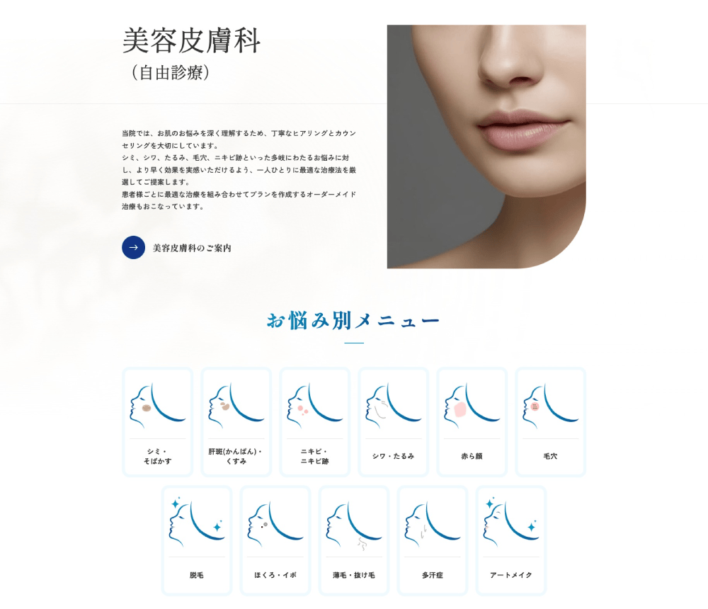 また、患者様が求める情報に迷わずアクセスできるよう、一般皮膚科(保険診療)と美容皮膚科(自由診療)の導線を整理しました。美容皮膚科に関しては、「シミ・そばかす」「シワ・たるみ」といった具体的なお悩みから施術を探せるカテゴリー設計を行い、ユーザビリティの向上を図りました。