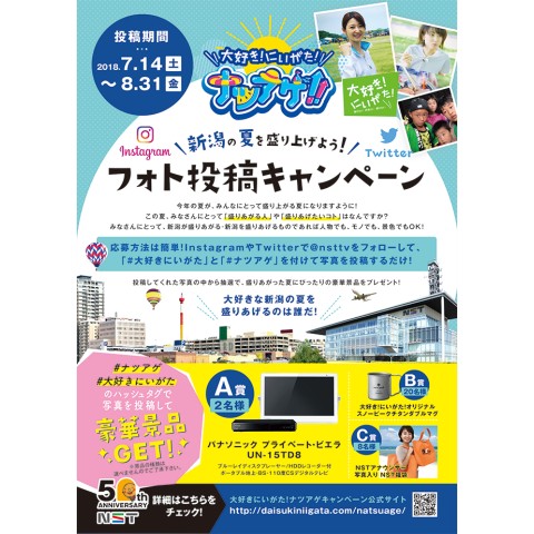 NST新潟総合テレビ様の地域貢献プロジェクト「大好き!にいがた!」の新しい試みとして、新潟の夏を盛り上げる新企画「ナツアゲ!!」フォトコンテスト Twitter/Instagramハッシュタグキャンペーン担当させていただきました。